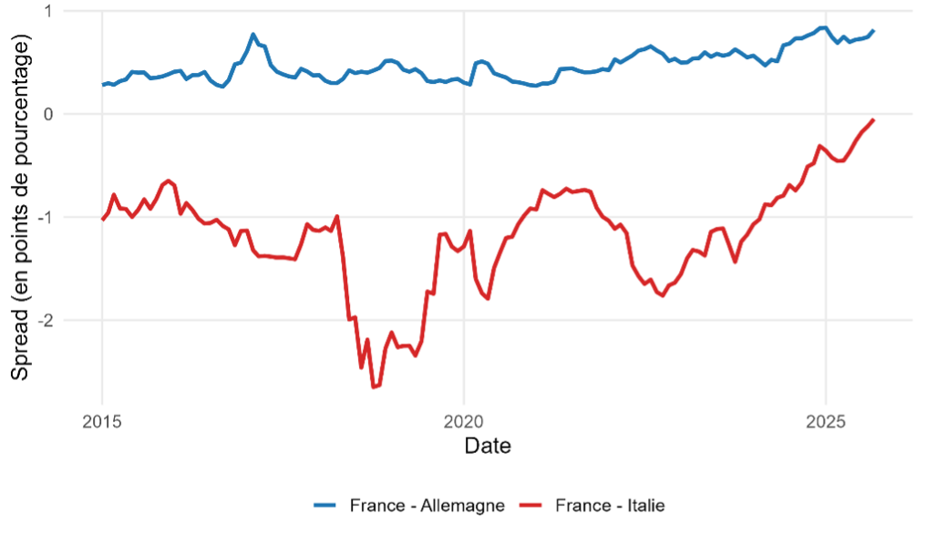 - l’évolution des spreads souverains France–Allemagne et France–Italie.
