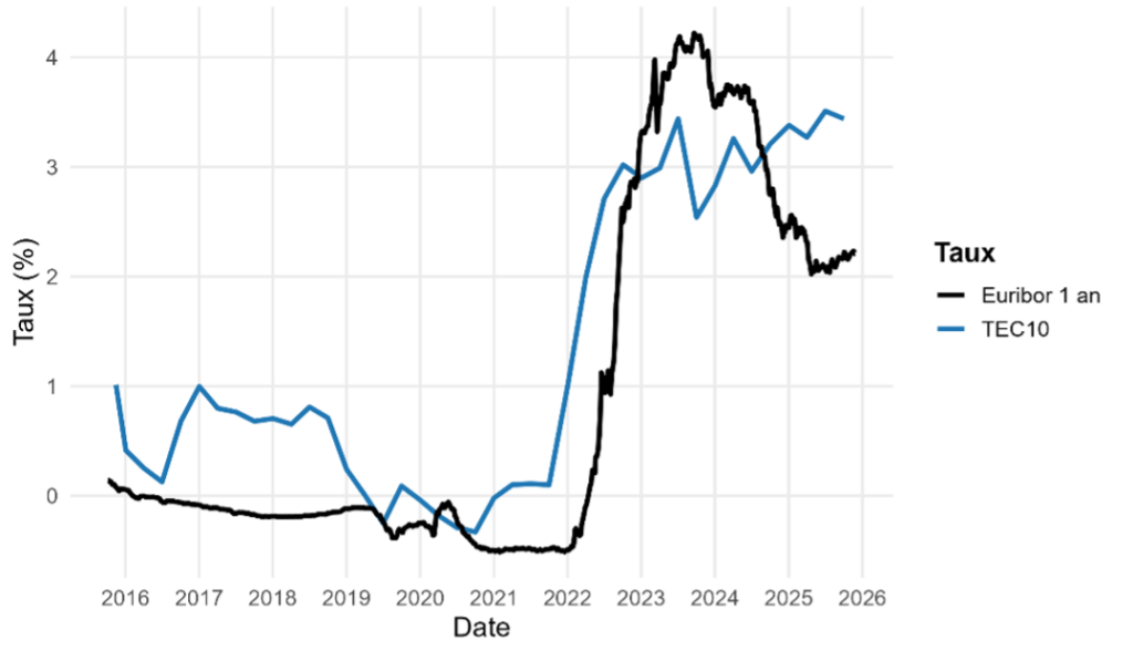 Depuis 2022 toutefois, les deux courbes ne présentent pas exactement la même dynamique. L’Euribor suit de très près le cycle de resserrement monétaire engagé par la BCE : il remonte rapidement, atteint un pic marqué, puis amorce un repli dès 2023. Le TEC10 évolue selon la même direction générale, mais avec une amplitude plus faible et une trajectoire légèrement plus volatile. Cette différence tient au fait que le TEC10 n’exprime pas uniquement l’effet de politique monétaire : il intègre également une composante propre au marché des dettes souveraines françaises, liée aux variations de la prime de risque. Lorsque le spread souverain se resserre, le TEC10 peut se stabiliser ou diminuer, même si les taux courts restent encore orientés à la baisse.